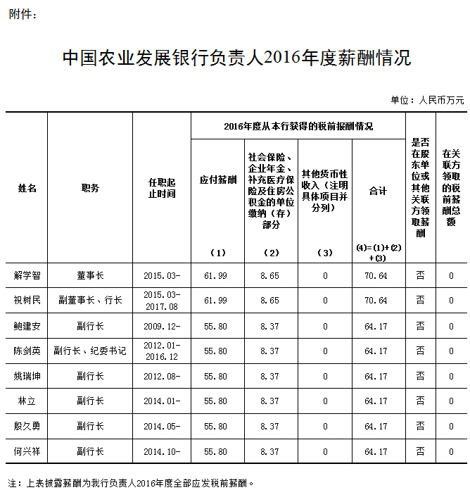 自2015年1月起,中國農(nóng)業(yè)發(fā)展銀行董事長、行長及其他副職負責(zé)人的薪酬,按照國家關(guān)于中央管理企業(yè)負責(zé)人薪酬制度改革的意見執(zhí)行。根據(jù)國家有關(guān)規(guī)定,現(xiàn)公開披露中國農(nóng)業(yè)發(fā)展銀行負責(zé)人2016年度薪酬。