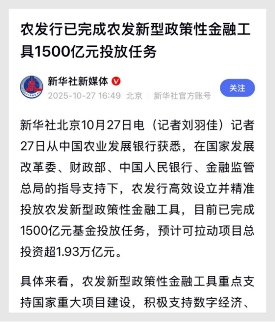 新華社:農發(fā)行已完成農發(fā)新型政策性金融工具1500億元投放任務