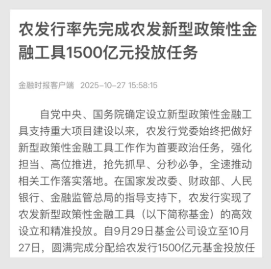 人民日報:農發(fā)行已完成農發(fā)新型政策性金融工具1500億元投放任務