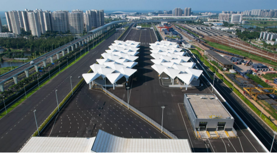 這是2025年9月23日拍攝的??谛潞8酆湍细邸岸€口岸”(貨運)集中查驗場海關查驗區(qū)(無人機照片)。新華社記者 楊冠宇 攝