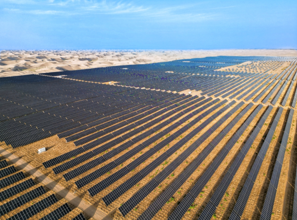 ▲農(nóng)發(fā)行貸款4.6億元,支持甘肅涼州區(qū)九墩灘100兆瓦光伏發(fā)電項(xiàng)目,建成后年均可節(jié)約標(biāo)準(zhǔn)煤5.8萬(wàn)噸,減少二氧化碳排放當(dāng)量17.3萬(wàn)噸。項(xiàng)目在光伏板外圍栽種阻沙林帶、內(nèi)部栽植低矮灌木,有效防風(fēng)固沙。